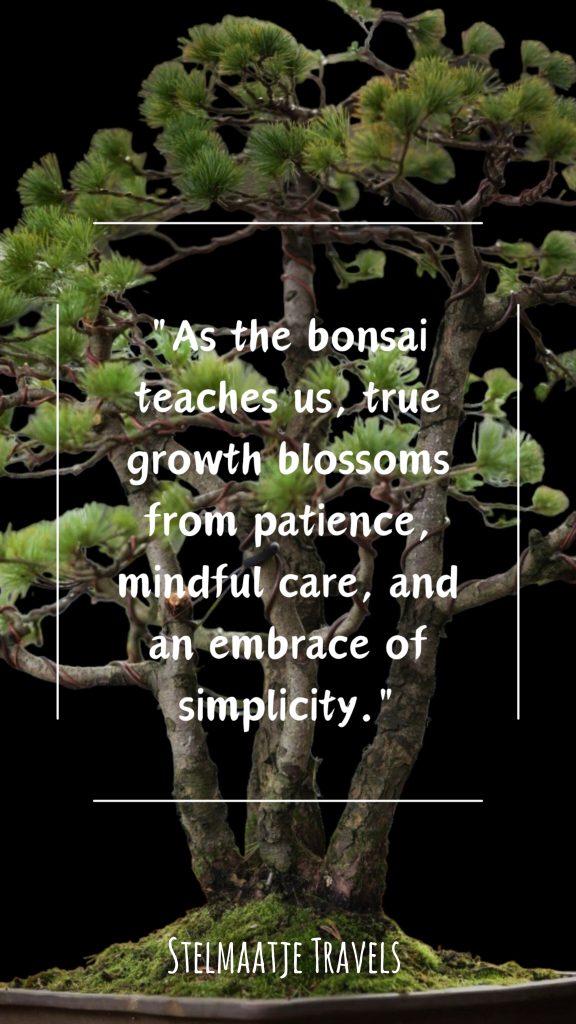 Bonsai heeft diepe wortels in het Japanse Zen boeddhisme, afkomstig van het Chinese Chan boeddhisme. Het vereist geduld, toewijding en een vredige geest om een bonsai boom te verzorgen en te vormen. Voor bonsai-beoefenaars is het verzorgen en vormgeven van de miniatuurbomen niet alleen een kunstzinnige bezigheid, maar ook een vorm van meditatie en contemplatie. Het is een kunstvorm die niet alleen de buitenkant van de boom transformeert, maar ook de geest van de kunstenaar.