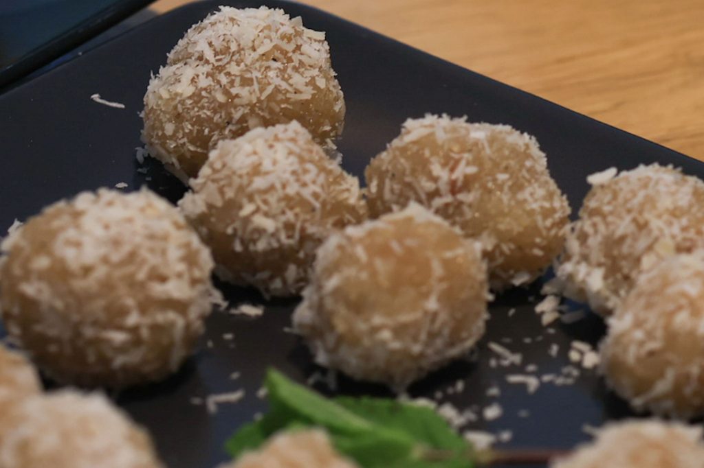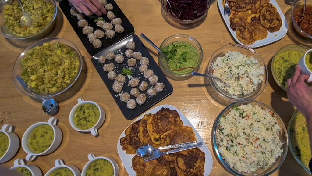 We hebben een uitgebreid buffet gemaakt van alle gerechten die we tijdens de kookworkshop gemaakt hebben. De tafel zag er feestelijk uit met al onze mooie vedische kookkunsten. Omdat in elk vedisch menu alle zes de smaken voorkomen, is een apart toetje niet echt nodig. Toch hadden we een lekkere ‘Indian sweet’, de kokos barfi, onder andere gemaakt van kokos, havermelk en een beetje rozenwater. De zelfgemaakte Chai latte was ook erg lekker, een thee van allerlei zoete kruiden zoals kaneel en kardemom, met gember, zwarte thee of rooibos, en melk of havermelk.