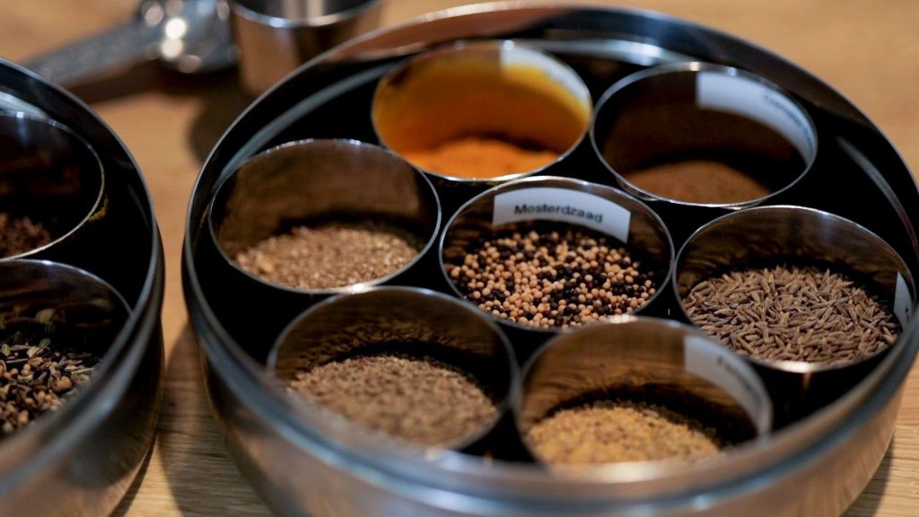 We begonnen met het verzamelen van de kruiden waar we direct mee gingen koken. In een gerecht worden namelijk best veel kruiden gebruikt en op die manier kon je meteen doorgaan. Sommige stukken in de recepten waren geel gemarkeerd en als je op dat punt beland was, dan haalde je Silvia erbij. Dit waren de aandachtspuntjes of de leermomenten voor de hele groep. Zo liet Silvia bijvoorbeeld aan de groep zien hoe je mosterdzaadjes net zo kon laten poffen als popcorn en hoe ze de Mung Dal liet badderen. Dit kun je ook weer terugzien in de video die ik gemaakt hebt.