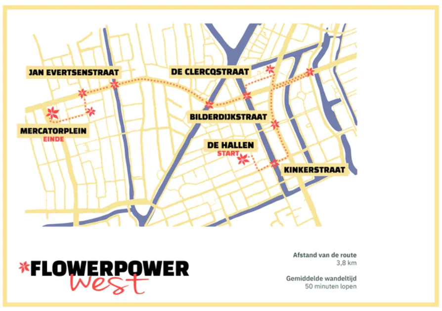 De route start in De Hallen, daarna Kinkerstraat, Bilderdijkstraat, De Clercqstraat, Jan Evertsenstraat en Mercatorplein. De route is ongeveer 3,8 km en je kunt hem wandelen of fietsen. De gemiddelde wandeltijd is ongeveer 50 minuten.